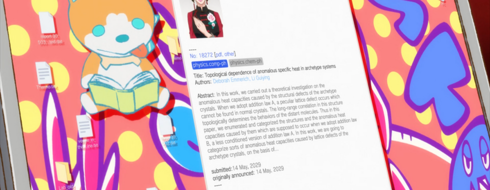 Meanwhile, Mei is on the express train back to Nigashio City trying to figure out what the archetype molecule is supposed to be. Due to the swarm of Rodans attacking the city, however, passengers are begging the conductor to turn back. Mei's A.I. companion, Pero 2, hacks into one of the robots at the Ōtaki Factory to investigate the situation of the city. In the aftermath, Mei meets up with Professor Li's substitute, Kai Takehiro, to discuss about a possible meet up with Professor Li in Dubai to discuss about her theory of creatures being made up theoretical matter. Within in the envelope of her invitation, Mei also receives a small cube with a flower inside it. She studies it more and believes this is the archetype that Mei was researching earlier.