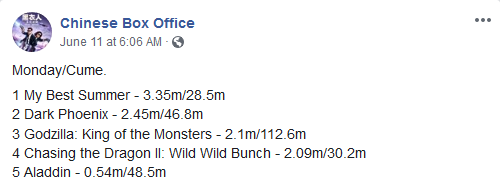 While China is wracking in most of the international box office numbers, Godzilla: King Of The Monsters is going to need more than just China. The movie is going to need a miracle in the domestic box office. Right now if you look at the daily domestic numbers the movie is on its last leg. It has only been pulling in $1 - $2 million this week so far. Usually, we wouldn't see these numbers until 5-6 weeks after the movie's release (unless that movie is Avengers: EndGame then expect that movie to keep breaking box office records for another two months). If you take a look at China's numbers, Godzilla: King Of The Monsters made $66 million on the first weekend, but then there was a 64% drop on the second weekend making only $23 million. When looking at the daily box office numbers for this week it's the same thing as the daily domestic box office making mostly $1 million. At this point China is just looking like this movie's life support before the plug is pulled. This is why the domestic box office is important. If the movie is not doing well on its home turf and overseas then the studio is not going to make that money back at all. If it keeps tracking like this then I'm predicting at least $350+ million worldwide by next month.