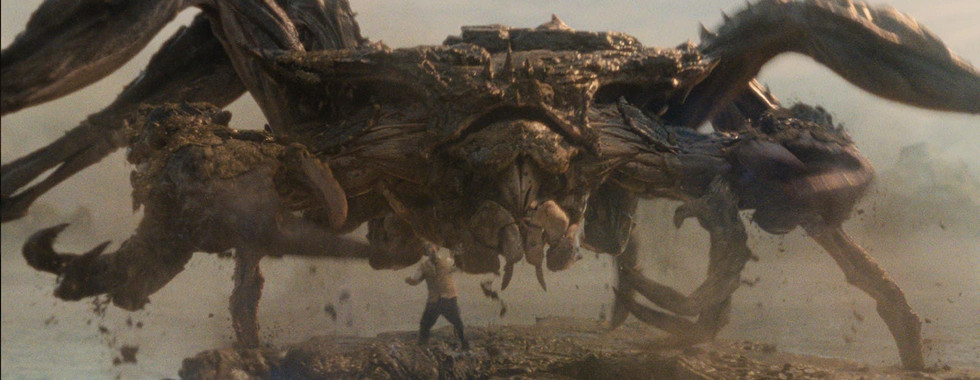 Along with all of this, we get to see clearer images of new monsters that we saw in previous trailers. We find out the monster with those tentacles surrounding the mouth belonged to a monster that resembles a cross between a mole and a pangolin lined with razor sharp scales or scutes. There is the crab monster, which KdM calls it "MANTLE CLAW," and this is the same monster we saw in the first trailer attacking the Mother Long Legs in that scene where John Goodman's character found himself cornered. We also see this fight fully in an extended clip that was recently released showing this fight not lasting very long, but it was pretty cool to see what happens. The last monster we see are the MUTO grubs that hatch out of the eggs. According to KdM, he calls them "ENDO SWARMERS" which are a different form of MUTO. So it will be interesting to see how these guys turn out as they look vicious chasing after the secondary group of characters.